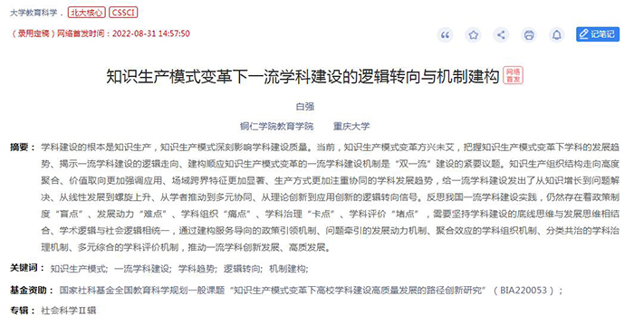 8月31日,高等教育研究领域重要学术期刊《大学教育科学》网络首发我校白强教授的最新研究成果《知识生产模式变革下一流学科建设的逻辑转向与机制建构》,该成果将在该期刊2022年第5期纸质刊印。该成果15000字,是白强教授近年来相继发表研究成果《大学知识生产模式变革与学科建设创新》(2020年)《世界一流学科的生成逻辑与建设路径——基于中外两所大学两个一流学科生长史的考察》(2019年)《中国特色“双一流”大学建设的逻辑根据与路径选择》(2018年)等CSSCI核心来源期刊论文之后关于学科建设的最新研究成果。