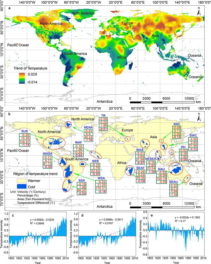 研究结果表明:(1)自1901以来,全球气温升高区面积达1.26亿km2,占全球陆地面积84.86%,而830.55万km2的陆地表面一直在降温,覆盖了五大洲和32个国家,占中国陆地面积的86%,形成了16个变冷区。(2)16个冷却区的平均冷却速率为-0.24℃/世纪。最大冷却速率为−1.40℃/世纪,是全球陆地变暖平均速度的1.43倍(0.98℃/世纪)。(3)近海冷却区受洋流影响较大,主要受小于30年的小时间尺度周期性影响,而距海相对较远、受洋流影响较小的冷区主要受大于30年的中等时间尺度影响。(4)32.33%的冷却区(268.49万km2)在未来将持续冷却,其余区域可能分别在2114、2041、2096、2099、2119、2073、2048和2101进行转暖。(5)全球降温或变暖的影响主要是由碳汇和蒸散量引起的生物物理效应以及地表反照率对地表热辐射的收支三个效应通过地表能量平衡的相互竞争作用所致,但是不同地区的净效应机制却存在显著的差异。