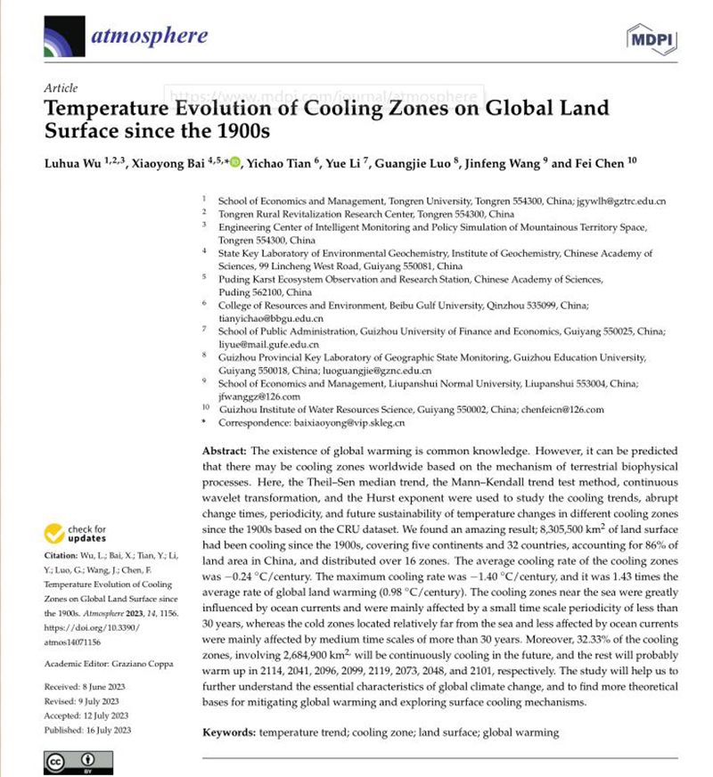 2023年7月,我校经济管理学院吴路华博士以第一作者在国际SCI期刊《Atmosphere》上,在线发表题为《Temperature evolution of cooling zones on global land surface since the 1900s》的学术论文(2023, 14(7), 1156:1-27;IF=3.11),揭示了百年以来变暖背景下全球陆地表面惊人的现象。