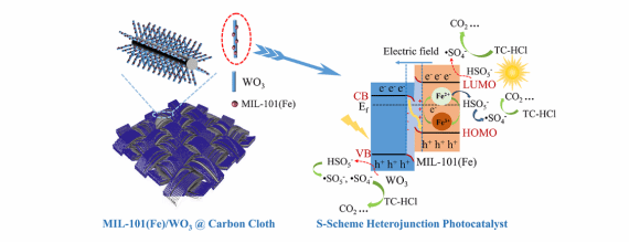 抗生素的过度使用会增加其耐药细菌传播的风险,进而对生态环境和人体健康构成重大威胁。为此,开发高效、绿色可持续且经济环保的技术对于解决抗生素污染的环境问题至关重要。该团队研究发现在碳布上构筑MIL-101(Fe)/WO3异质结,通过S-scheme电荷转移机制,显著提高了光生载流子分离效率和光催化活性。在可见光照下MIL-101(Fe)/WO3异质结催化剂20 min内实现四环素100%降解,并且该催化体系具有良好的催化稳定性和可回收性。该研究不仅为水体中抗生素类污染物的去除提供了一种有效的解决方案,也为设计和制备高效稳定的光催化剂提供了新的思路。